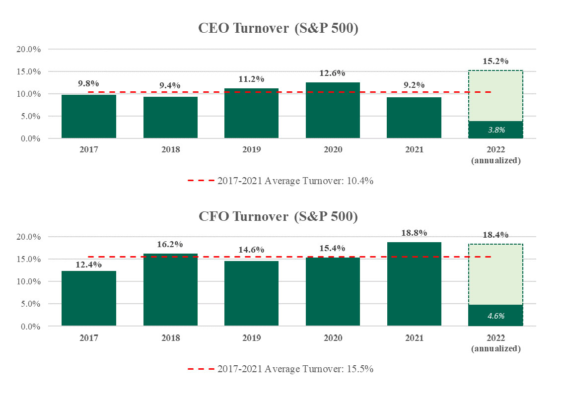 - Annual CFO turnover is typically higher than CEO turnover in part because CFO turnover includes both lateral (CFO) and upward movement (CEO or other senior leadership roles).
