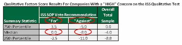 4)Â Â Â Our research suggests that once a company receives a “FOR” or “AGAINST” vote recommendation from ISS, the Qualitative Factors Score is not influential on the actual shareholder vote independent of the ISS recommendation. Said another way, the shareholders care about the ISS recommendation, but appear to be less concerned about the specific qualitative factors. This needs to be factored into the ISS response strategy.