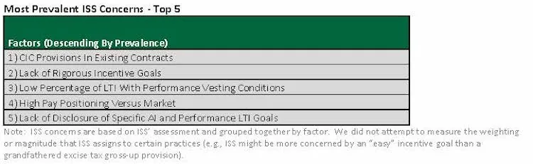 In many cases, even companies that received a “FOR” vote recommendation still received a concern on some of these factors (e.g., CIC provisions, rigor of incentive goals, and pay positioning). Therefore, this list should not be construed to represent the factors weighted most heavily by ISS.