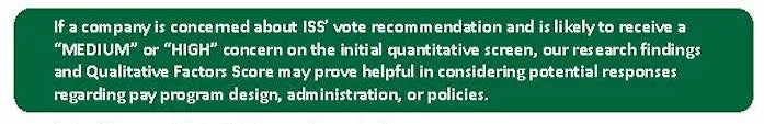 2)Â Â Â Understand how ISS will respond to current and potential pay practices Companies should simulate the ISS quantitative tests prior to final fiscal year pay decisions and proxy publication. It is important to be aware of ISS’ potential views, particularly if the company expects a “MEDIUM” or “HIGH” concern on the quantitative test, which would likely result in a more rigorous qualitative review.