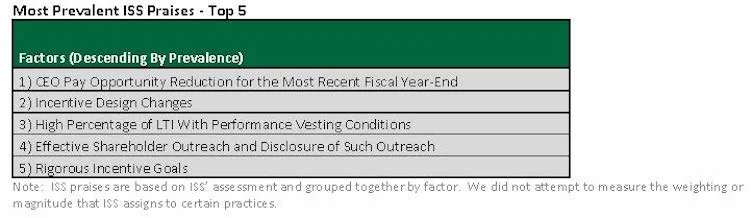 Similarly, we compiled the most common ISS praises of pay programs when it provided a “FOR” vote recommendation:
