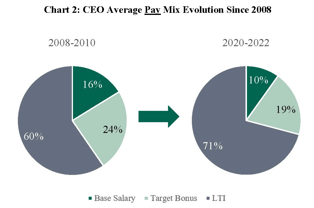 - S&P 500 CEO pay is significantly more performance-based than it was before SOP: today, 90% of CEO pay is delivered in annual or long-term incentives versus 84% before SOP.