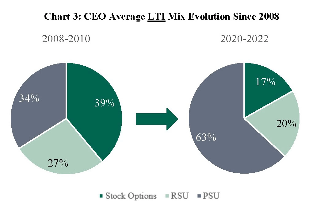 In addition to the continued compression in CEO pay observed above, SOP has changed how compensation is delivered to top executives. The clearest observable impact of SOP is a moderate shift of the total CEO pay mix towards incentive compensation (an increase from 84% of total pay to 90% of total pay) and an even more significant shift in the mix of long-term incentive (LTI) vehicles away from stock options and towards leveraged long-term performance plans: PSUs, on average, comprised 34% of total LTI before SOP and now represent 63% of total LTI.