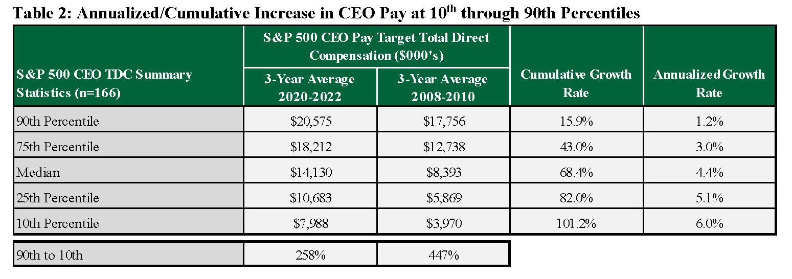As shown in Table 2 below, while CEO pay increased at all percentiles over the study period, increases at the 90th percentile were significantly lower than increases at other percentiles. At the 90th percentile, annualized CEO pay increases were just 1.2%, compared to annualized increases ranging from 3% at the 75th percentile to 6% at the 10th percentile over the period from 2008 to 2022. The large cumulative increases of ~100% at the 10th percentile show how pay for the CEO role at smaller/lower-paid companies are catching up to the overall median.