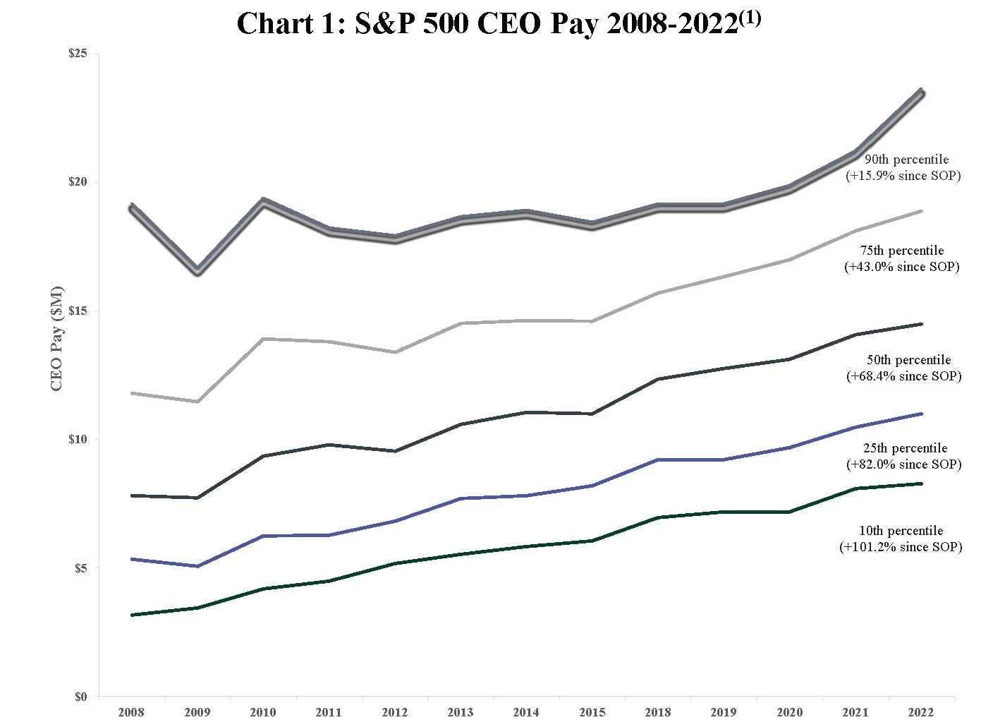 Pay Governance examined CEO pay for a constant-company sample among the S&P 500 index, comprising 166 companies over the 15-year period from 2008-2022. Chart 1 below plots CEO target TDC over the 15-year period, representing the three years before implementation of SOP and 11 years post-SOP. The chart shows that CEO pay has increased at every percentile post-SOP, although increases were less pronounced at the 90th percentile, as we will discuss below.