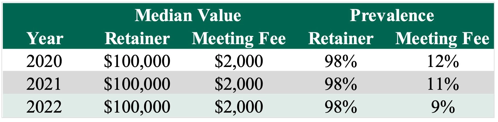 The median value of annual cash retainers for board service has remained constant at $100,000 over the last three years. We continue to observe fewer S&P 500 companies providing meeting fees, with the most recent prevalence at 9% (compared to 12% prevalence in 2020 and 18% prevalence in 2015). However, we note that the decline in the use of meeting fees is somewhat offset by the increase in committee member retainers. Among companies that provide a fee for each board meeting attended, the median value of $2,000 per meeting has remained constant over the last three years.