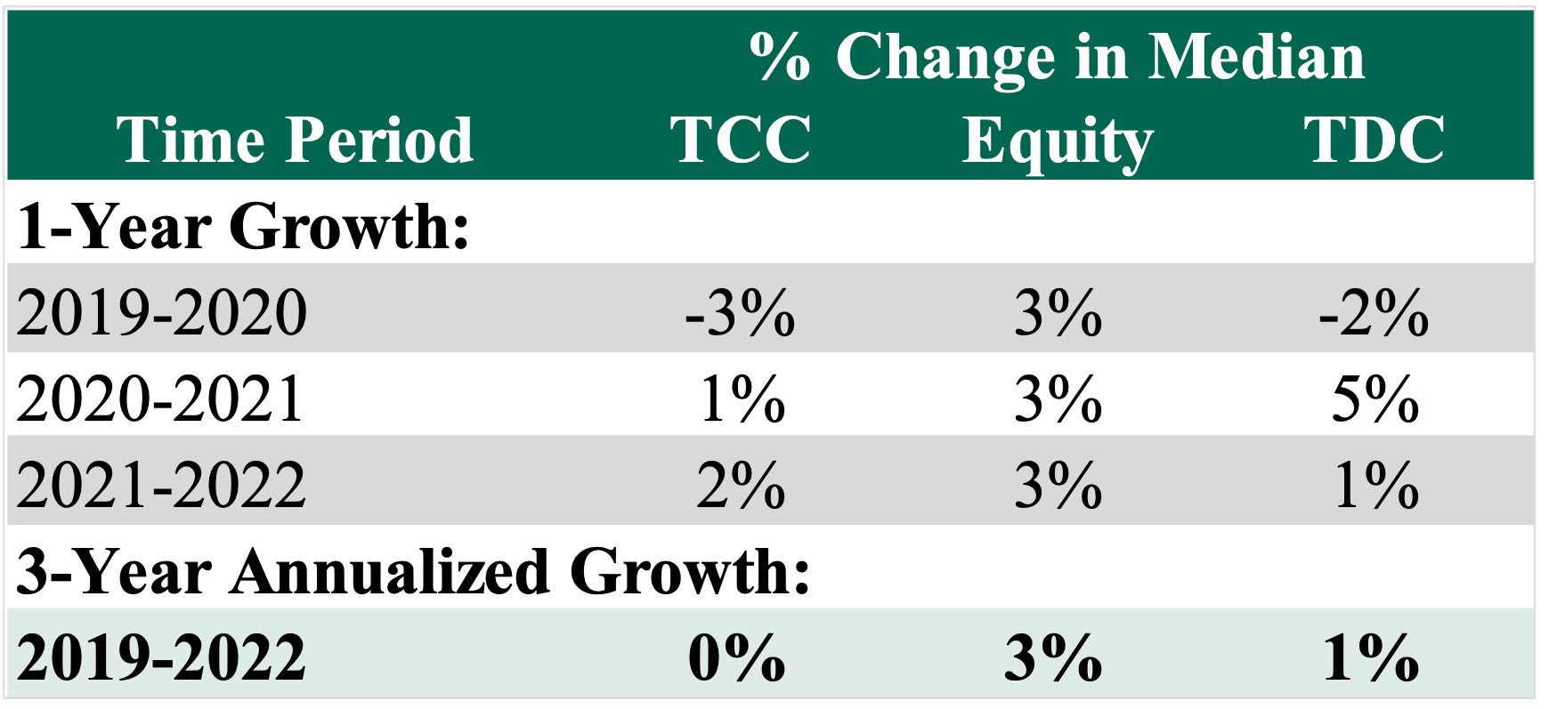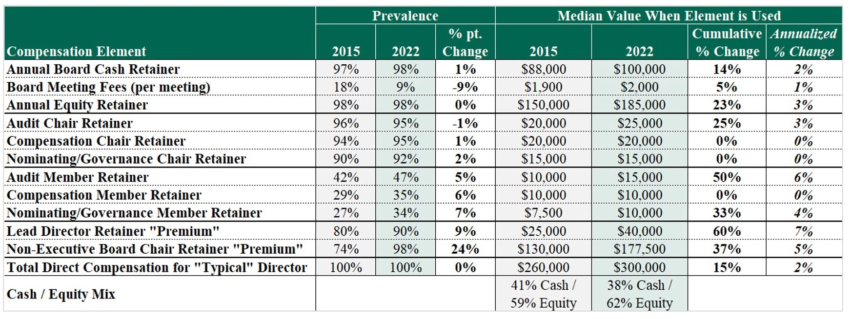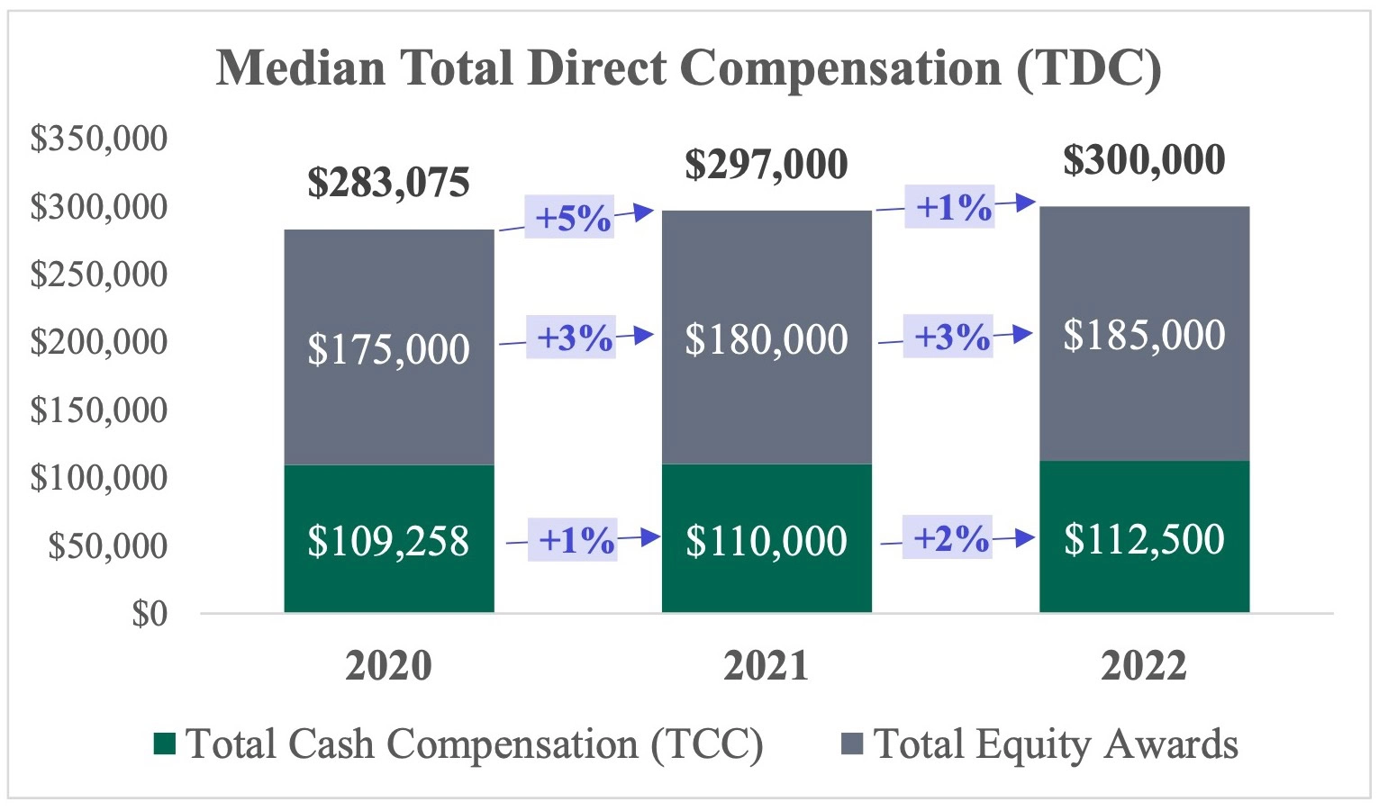The median sum of all cash-based and equity-based fees to a director who is not in a board or committee leadership role (a “typical” director) was $300,000 for 2022 and reflects a modest increase of +1% compared to 2021 median TDC. This followed a higher increase of +5% between 2020 and 2021. Many companies froze or deferred increases to director compensation levels during the pandemic but resumed increases for 2021 as observed in 2022 proxy filings.