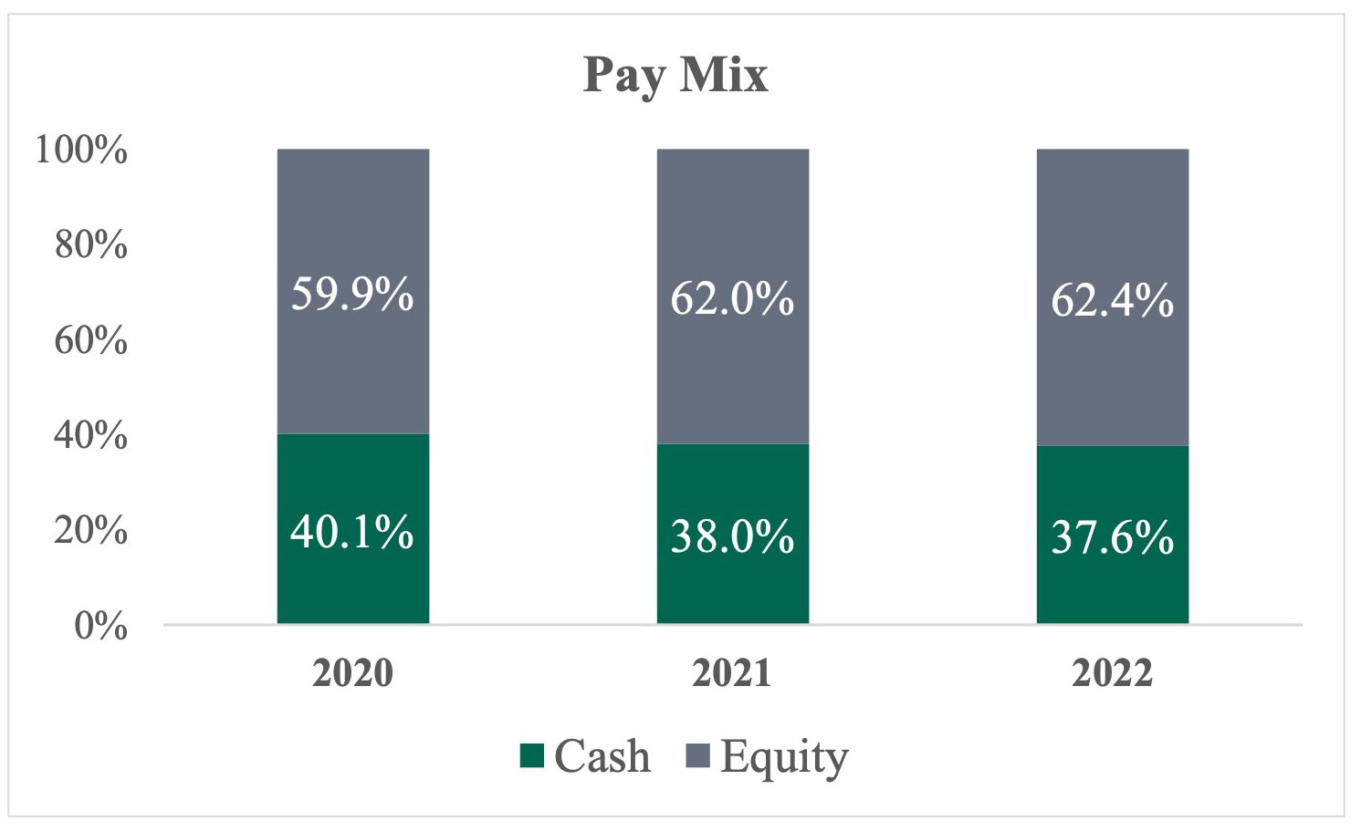 The portion of total compensation delivered in cash versus equity, or overall pay mix, has been relatively stable at approximately 40% cash and 60% equity. Over the last two years, we have seen the proportion delivered in equity inch slightly higher (to 62% equity), as meaningful increases in director compensation are more commonly provided through equity than through cash-based compensation.