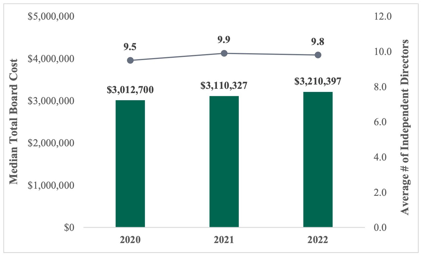 The size of S&P 500 boards has remained relatively stable over the last three years, with an average of about 10 independent directors serving on the board. The median total board cost, or the aggregate of all cash and equity-based fees plus “all other compensation” actually paid to all non-employee directors as reported in the proxy statement’s “Director Compensation Table,” increased to about $3.2 million in 2022. This represents an increase of about +3% over the 2021 total board cost and, over the last three years, reflects an annualized increase of +2%.