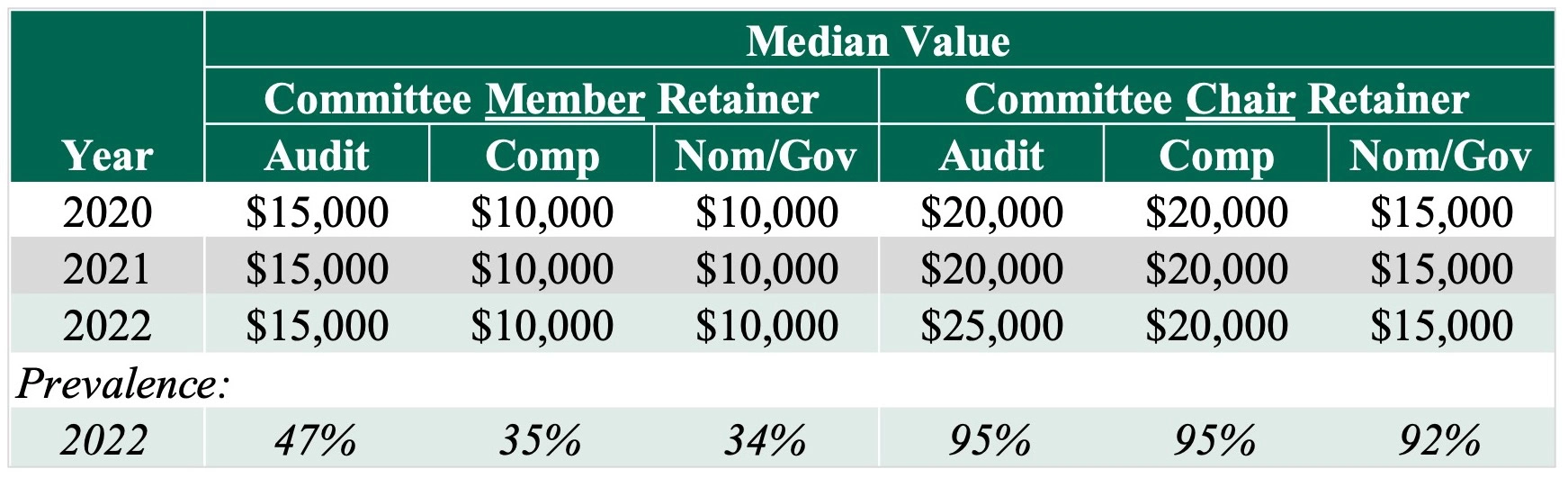 Additional retainers provided to committee members and chairs have remained stable over the last three years. The only increase observed at the median was for Audit Committee Chairs, where the median value increased from $20,000 to $25,000 in 2022. This reflects a differentiation from Compensation Committee Chair retainers where the median value remained at $20,000. The Chair of the Nominating and Governance Committee continues to have a median retainer of $15,000. When additional fees are provided for committee service, members of Audit Committees typically receive a higher retainer (median value of $15,000) than members of other committees (median value of $10,000).