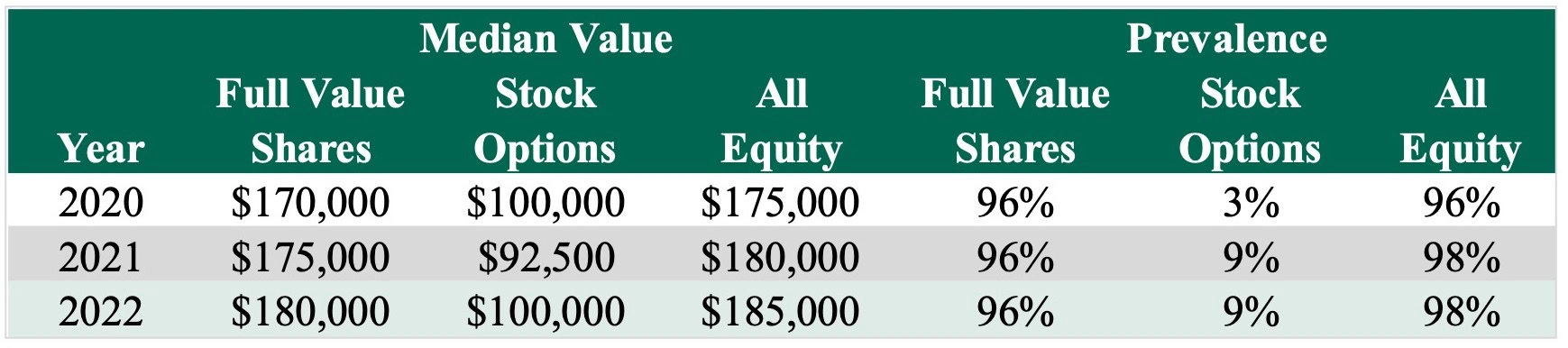 The median value of total equity awards has steadily increased over the last three years, with the most recent median value equal to $185,000. Although full value shares (e.g., restricted shares/stock units, deferred shares/stock units, common stock) remain nearly universal in prevalence (provided by 96% of S&P 500 companies), the use of stock options has increased slightly since 2020 (provided by 9% of S&P 500 companies in both 2021 and 2022).