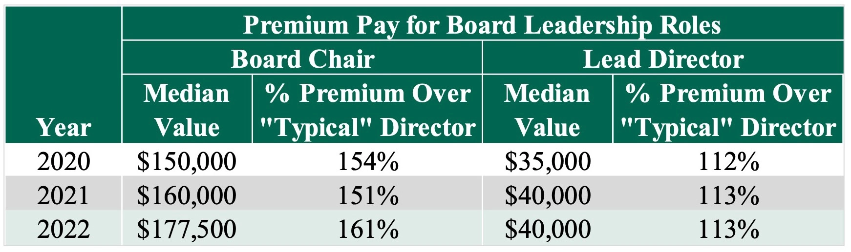 In the last three years, we observed a steady increase in premium pay for Non-Executive Board Chairs and a modest increase in premium pay for Lead Independent Directors. The median value of incremental fees for Non-Executive Board Chairs was $177,500 in 2022 and represents 161% of the total pay that is provided to a “typical” director. The median value of incremental fees for Lead Independent Directors was $40,000 in 2022 and represents 113% of the total pay that is provided to a “typical” director.