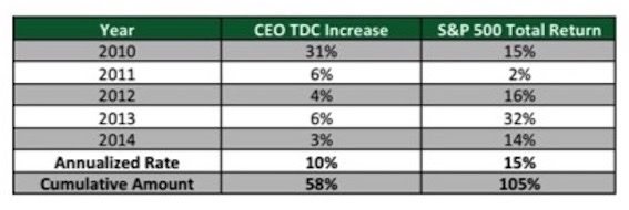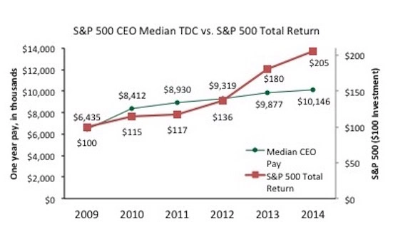 S&P 500 CEO TDC and the return of the S&P 500 have both increased since 2009, with the S&P 500 performance increasing at a faster rate than CEO pay. More recent CEO TDC increases have been relatively moderate compared to the overall S&P 500 achievements.