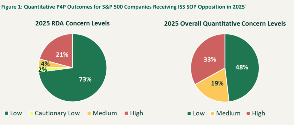 In 2025, Institutional Shareholder Services (ISS) opposed 10% of S&P 500 company Say on Pay (SOP) proposals. This was consistent with ISS’s historical average “against” rate from the previous five years (2020 through 2024). In this Viewpoint, we explore the ISS quantitative pay-for-performance (P4P) outcomes and the qualitative rationale provided by ISS for SOP opposition for S&P 500 companies in 2025. We also look ahead to what the findings may signal for the 2026 SOP season.