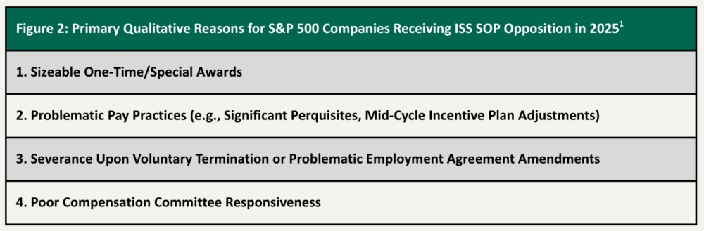 In general, in 2025, companies demonstrated strong alignment on ISS’s quantitative P4P tests (and particularly on the Relative Degree of Alignment (RDA) assessment that compares relative CEO pay to relative total shareholder return (TSR)). Therefore, ISS’s qualitative review, in which it scrutinizes compensation design and governance practices, drove much of ISS’s 2025 SOP opposition. Specifically, ISS flagged companies for using special awards and providing severance benefits for voluntary separation, as well as other practices it views as problematic.