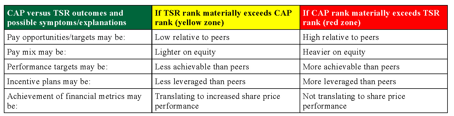 - A disconnect between relative CAP and TSR may be traceable to competitive deficits/ surpluses in executive compensation strategy and policies, which may need to be addressed